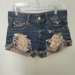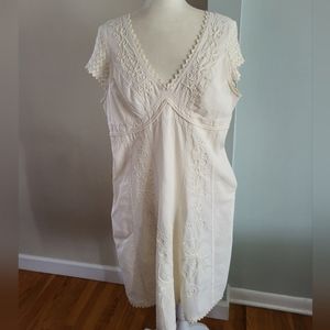 Off white/eggshell color, crochet details, scoop hem. Cotton. Has stretch. Good condition.