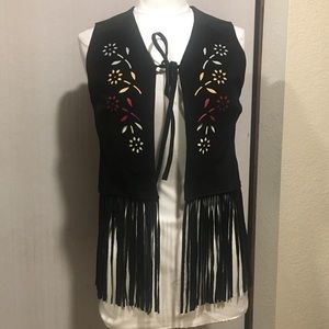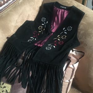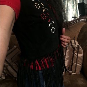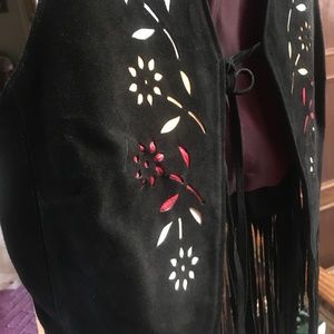 Cut out design, This beautiful and unique bohemian festival suede leather vest has flower-shaped cuts filled with colored leather or some like. Doesn’t have tags but is like small size, bust: 35” open shoulders to armpit: 9”, shoulders to end of fringes:26”. Suede Leather Vest HiPPiE BoHo Rocker Vest Festival