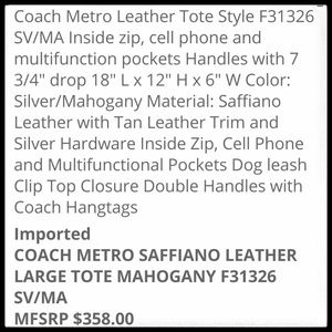 🚫SOLD🚫 ⭐2X HP⭐ Coach Metro Leather Tote, Mahogany NWOT