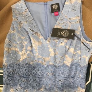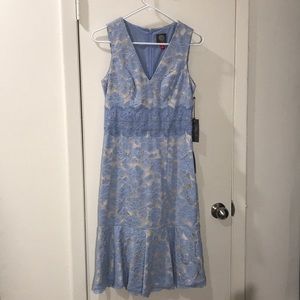 Worn once Vince Camuto cream sheath dress with ice blue floral lace overlay. Gorgeous mermaid style flare at the knees. Size 0 fits more like a size 2. Great to wear for any summer or holiday parties!