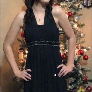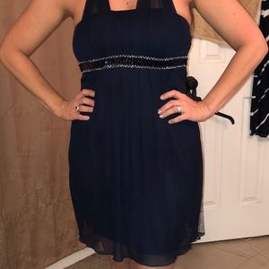navy halter dress sz M(6-8). Sheer overlay.