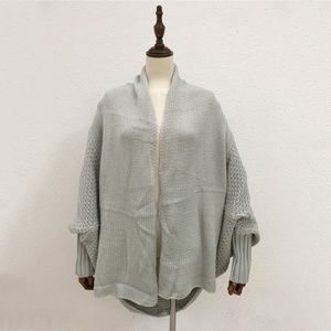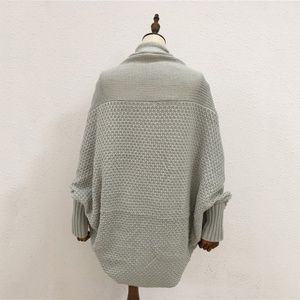 So soft, easy to wear waffle chunky knit cardigan with dolmen sleeves. The trick to wearing this is that the sleeves are on the BOTTOM. It seems counterintuitive, but I promise it works. When you put it on it feels like you’re getting a warm hug. Length 35-1/2” Content: 100% acrylic.