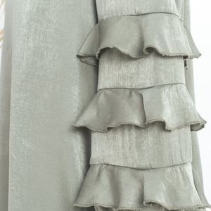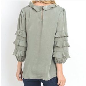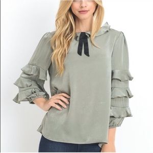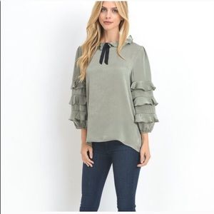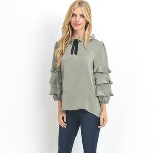 A sage colored ruffled top with a self tie ribbon. Tiered ruffled sleeves. Top