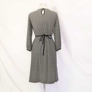 It makes me feel like I'm in a Tim Burton movie. Black White Wool blend knee length sheath with stretch. Decorative button placket at neckline with 4 tiny covered buttons and narrow panel satin at waist. I love this dress so much but I live in San Diego and it stays too warm to get enough wear out of it and it needs to go out to play more.