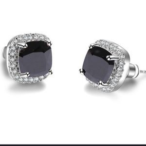 Beautiful synthetic cushion cut black center stone surrounded by white sapphires in a silver plated halo setting. Will be packaged in presentation box upon request.