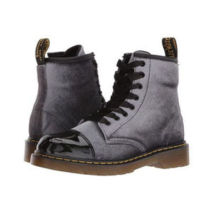 Doc Dr Martens grey blue velvet patent 8 eye boots