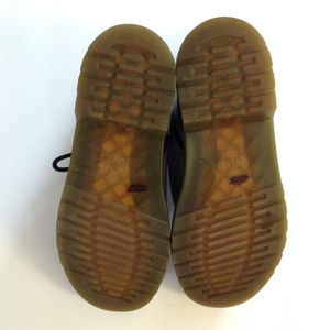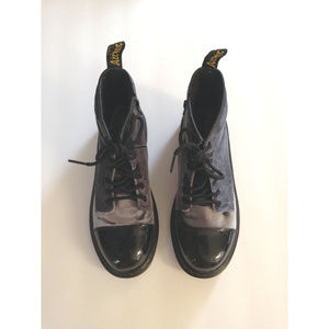 Silver-y blue-ish grey-ish velvet Docs with shiny black patent toe caps. 8-eye laces with zippered sides. Classic bouncing sole! In excellent condition; the soles don't look like they've ever touched pavement and the uppers look great, too.