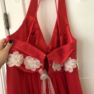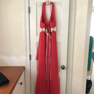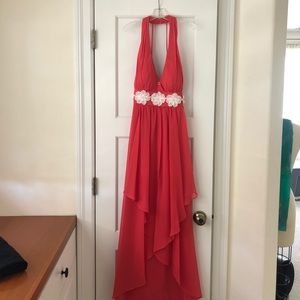 This gorgeous coral colored floor-length formal dress comes with professional alterations, including the added embellishments of the white lace flowers and Swarovski crystals (see photos). It is backless, except for two skinny straps that stretch to the halter neckline.