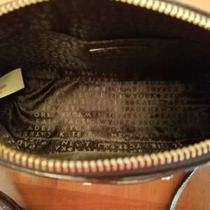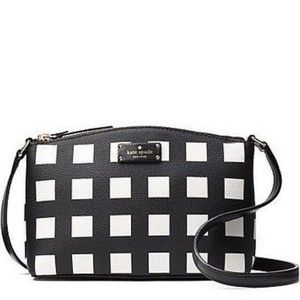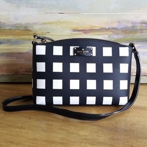 Kate Spade crossbody bag in a classy black and white check print. Top zip closure with gold plated hardware. Strap is adjustable up to appx 24" drop. Black jacquard lining with one interior slip pocket. Appx 9"w × 6"h x 3"d. Brand new with tag.