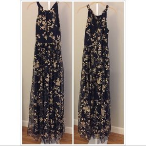 This ethereal A-line dress is cut from tulle and embroidered head-to-toe with delicate gold florals. A cutaway halter neck and back bow finish the look.