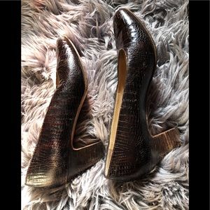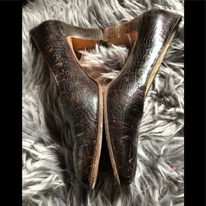 Classic Ferragamo gorgeous dark brown Italian leather embossed crocodile shoes. Two inch heel. Worn, loved and cared for in a smoke free pet free home. They are still in great condition and look beautiful.