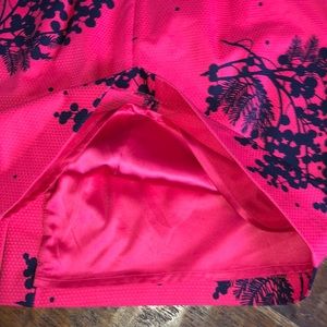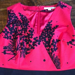 Color is either a light red w pink undertone or dark pink w red undertone and a navy blue floral print. Pic 3 might be truest but it’s still NOT that vivid.