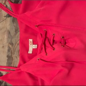 This dress is so fun and bright! The hot pink color is vibrant and the lace up detail gives it a little something extra. This dress is new with tags and comes from a pet free/smoke free home.