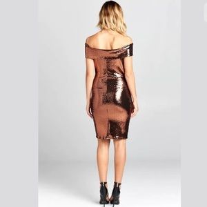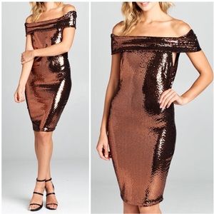 Featuring a metallic copper stretchy bodycon dress with sexy off the shoulder style. Made up of tiny round copper 'pixel sequins' (they are flat - not actual sequins) over a black background. Comes to just about knee length. A perfect dress for holiday parties and ringing in the New Year!!