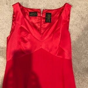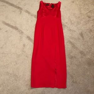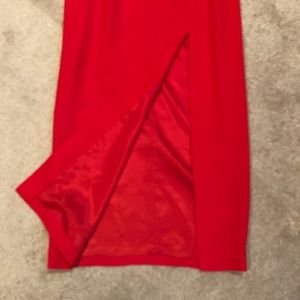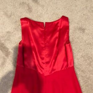 Won once for a black tie wedding. Perfect for weddings, galas, balls, bridesmaid dress, prom, or other special occasions. Size 6. Coral color. Front slit, rear zipper, vneck. Combo acetate and polyester material. Has been dry cleaned since it was worn. 17 inches armpit to armpit. Waist 14 inches. 52 inches long.