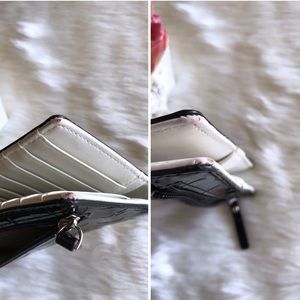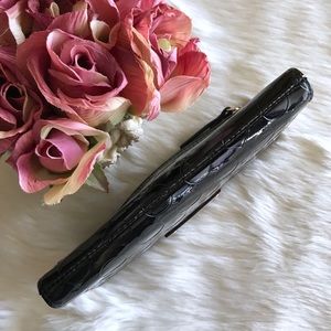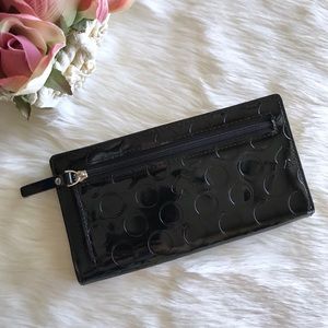 Black patent polka dot embossed wallet with leather trim. Last two pictures shows signs of wear to corners of wallet and inside. Overall great condition.