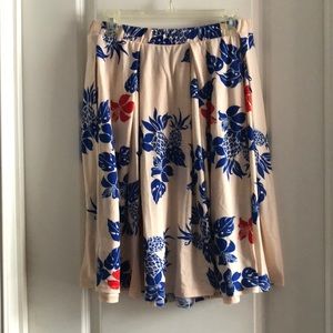 Lularoe Maddison Skirt, Blush pink w/ blue and red Hawaiian pattern.