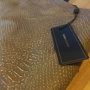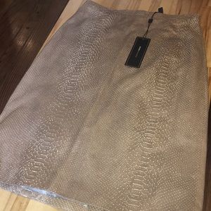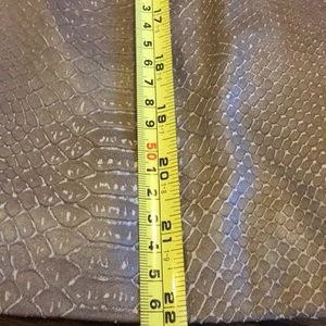 Supple leather in snakeskin pattern hits just above the knee. This classic “gravel” neutral can be dressed up or down.
