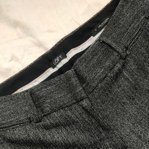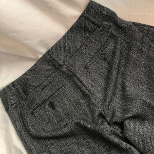 Full length, mid-rise, straight leg trouser in charcoal grey tweed. Flattering fit for curvier figures. No front side pockets make for a cleaner look. Fabric is a heavier weight poly blend perfect for cooler weather. Belt loops and button closure rear pockets. Approx. inseam 32”.