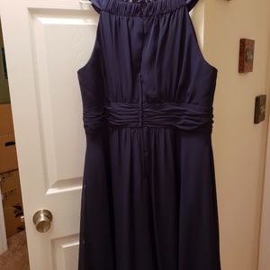 Navy blue chiffon dress with high neck, hits just below the knee. Worn once. Was not dry-cleaned after wedding, only spot cleaned. No flaws or stains.