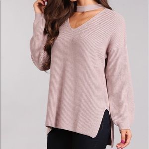 Chunky knit choker neck pullover sweater with v-neckline, long sleeves, and slit at side seams. Color is light Mauve.