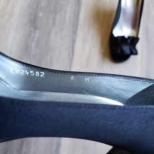 Stuart Weitzman 'Gigiritz ' black satin open-toe pumps with dressy ruffled bows. Featuring lean classic lines paired with gorgeous workmanship. Wore once and in perfect condition. Size 6M.