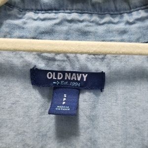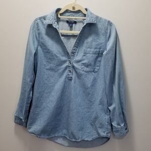 Soft half-button up chambray shirt from Old Navy. Great material. No stretch. Buttons on cuffs. So cute, and great for layering! Wish it still fit!