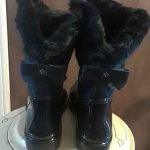 Adorable bow on the back of boots with Kate Spade logo. Pull on style with faux fur lining and rubber out sole.