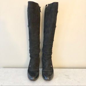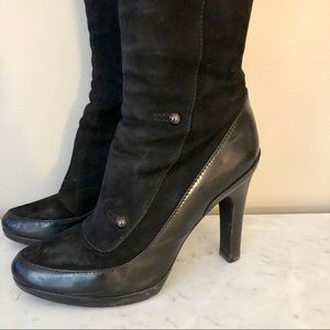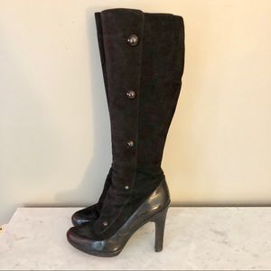 Black Suede Fendi round-toe knee-high boots with accents, stacked heels and zip closure at insteps.