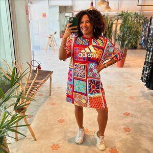 Soft cotton jersey is cut with a low v-neckline, smocked empire waist and bell sleeves. It's adorned with Johnny Was' signature elaborate embroidery- art nouveau vines and intricate roses. The color is 'sangria', a medium burgundy red. Skirt ends at or just above the knee. Unlined. 100% cotton, machine wash.