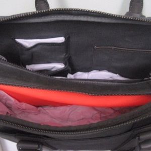 Main large zip compartment with the 15” laptop sleeve with scratch closure. Enter organized pockets, horizontal front zippered pocket. Carry handles with leather reinforcement, detachable shoulder