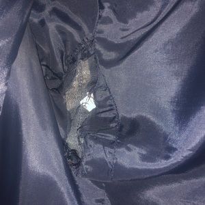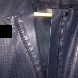 Very delicate navy blue Vince leather jacket. Fabric and leather sleeves, 2 pockets, zips all the way up, buttons at top and bottom. There is a hole on the inside seam, I believe it can be sewed. No holes in the leather. Bug and smoke free! Please see all pictures!