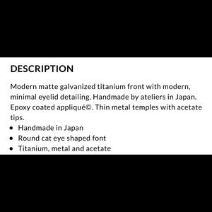 Modern matte galvanized titanium front with modern, minimal eyelid detailing. Handmade by ateliers in Japan. Epoxy coated appliqué©. Thin metal temples with acetate tips.