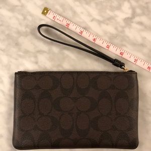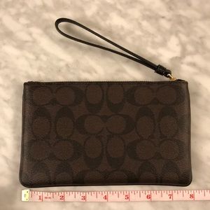 New Coach Wristlet with brown and black logo design. Dimensions included in the images.