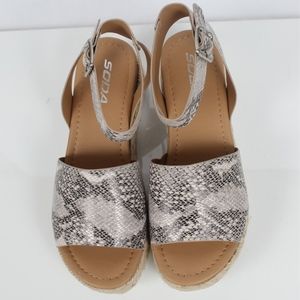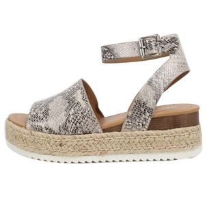 Beige Python faux leather open toe halter ankle strap espadrille flatform sandal. Platform 1 1/2" to 2 1/4". Model is a size 7, she is modeling a size 7 which fits her perfectly.