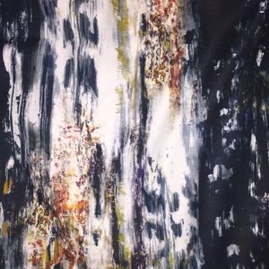 I love the abstract art/brushstroke print with an array of colors. Dark real, blue, rust orange, green and white all make appearances.