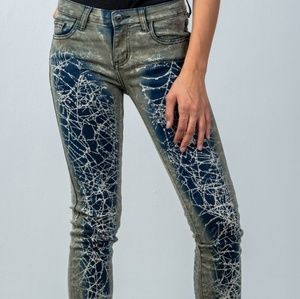 Stay on trend in these cute, sexy gray skinny jeans. Each pair has a slightly unique paint splatter and tie dye design. 5 pocket styling. Midrise. Pair with boots, flats, or even heels for super cool looks.