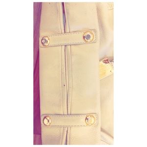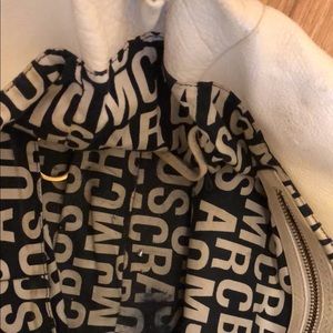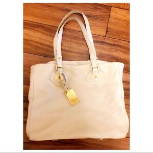 Marc Jacobs ivory leather purse. Gently used condition; there is some slight wear on the handles but still has a lot of life in this bag. Genuine leather & all hardware attached & in good condition. The lining is signature Marc Jacobs print, but there is an ink stain on the bottom of the bag (as pictured.)