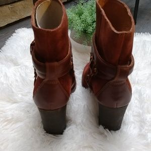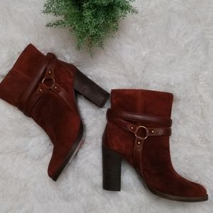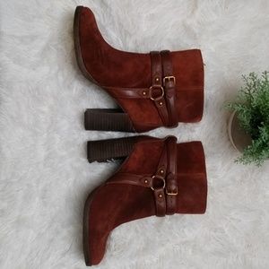 Suede ankle boots by UGG®, featuring leather harness detailing with metallic hardwear and a stacked heel.