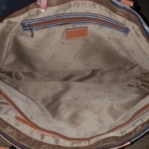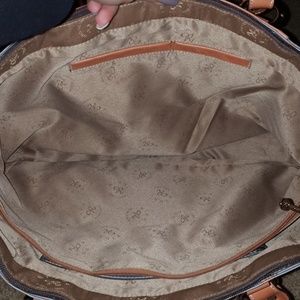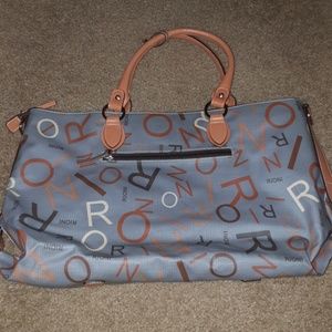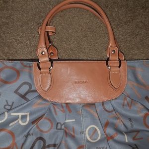 This Rioni Medley bag features grey, canvas construction with multi-shade brown scrambled Rioni letters. Brown leather trim and monogrammed lining complete this stylish tote bag. Perfect conditions. Like new.