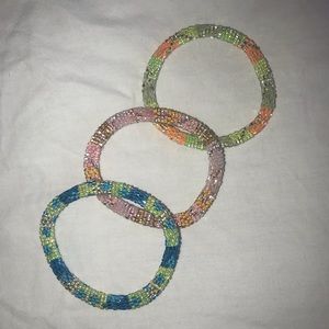 three colorful bracelets!! can wear all 3 together or wear one separately! color range so you can mix and match! Willing to negotiate!!