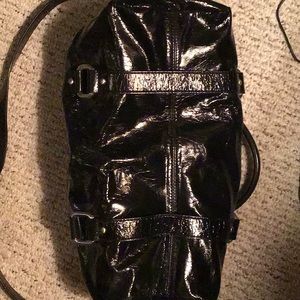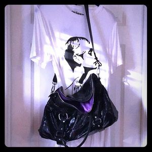 Gorgeous Black Patent leather shoulderbag with crossbody strap, purple interior, silver hardware 17” L x 11” H x 7” W, like new, excellent used condition, may not have actually been used as I see the silica bag still inside and super clean. Bundle and Save.