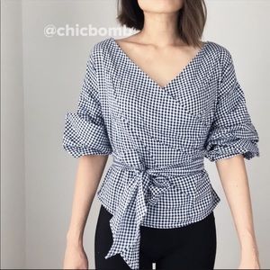 Kitty Gingham wrap around puff sleeve top.