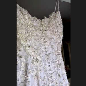 This gown was customized; added crystal beads along the zipper and added thin beaded straps. Pictures do no justice, this is a beautiful wedding gown.