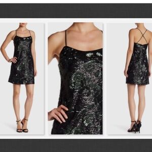 Gold-burnished sequins and beads drip liquid shimmer down the sheer mesh overlay of a party-ready cocktail dress.