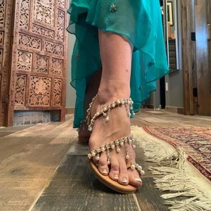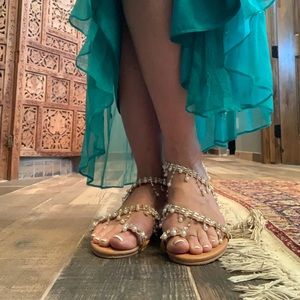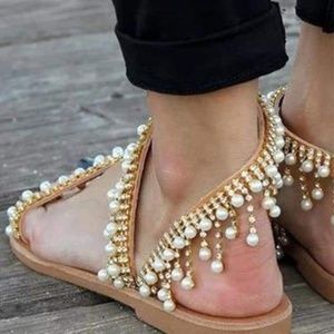 NIB Beautiful unique bohemian pearl and rhinestone embellished Greek inspired summer sandals. So fun and feminine, wear them with jeans, shorts, skirts or dresses..wear them to the beach or an occasion and they will be a guaranteed show stopper. Your new sandals delivered in dust bag. Please refer to and choose your size dependent on sole measurement on chart attached, size up if your a half size as they run slightly small.