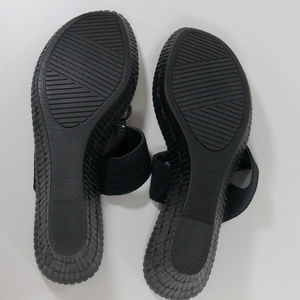 Super pretty, pewter with black texture strap and a bling ring! Plastic bamboo texture wedge. Size 8.5. Heel: 3"