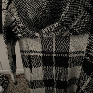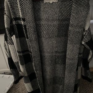 Heavy weight, black and white knit cardigan with hood. The sweater runs just above the knee and front hangs open. It's a great alternative to a jacket in fall temperatures.