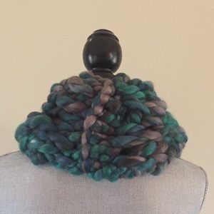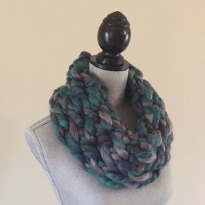 Handmade arm knit chunky infinity scarf. One loop. Grays and blue/greens. Acrylic. Soft!