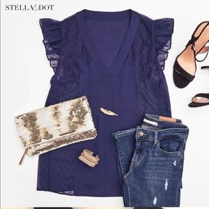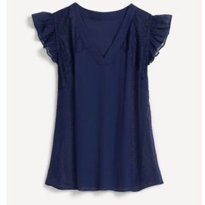 Cute Navy flutter sleeve top with navy polka dot sheer side panels and lace detailing. NWT XL